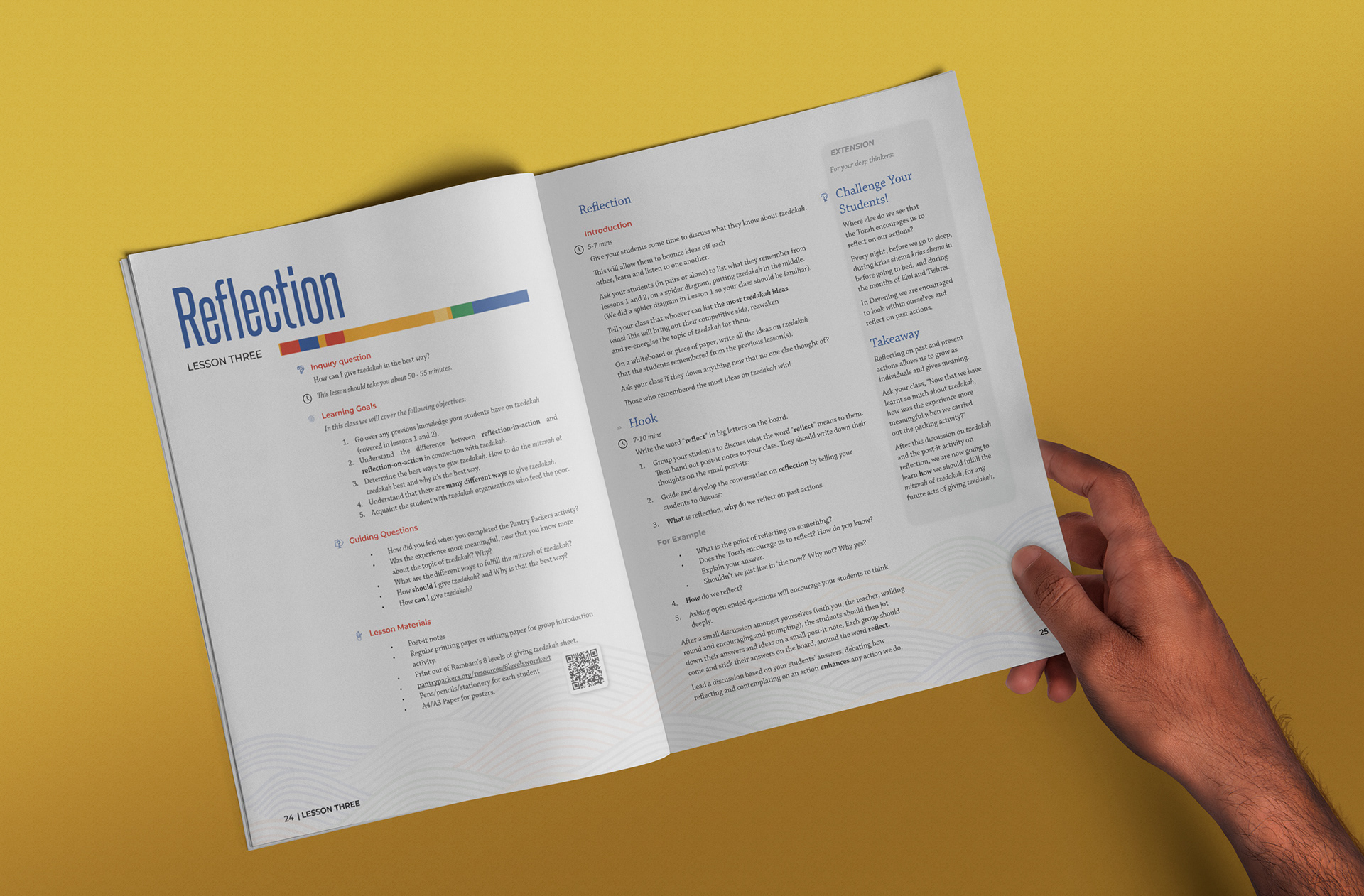 The Tzedakah booklet for middle school students features a vibrant, playful design with fun patterns and colorful illustrations. Bright, contrasting colors and engaging typography highlight the key messages about the importance of giving. The design is visually appealing, making the booklet both educational and inspiring for students.